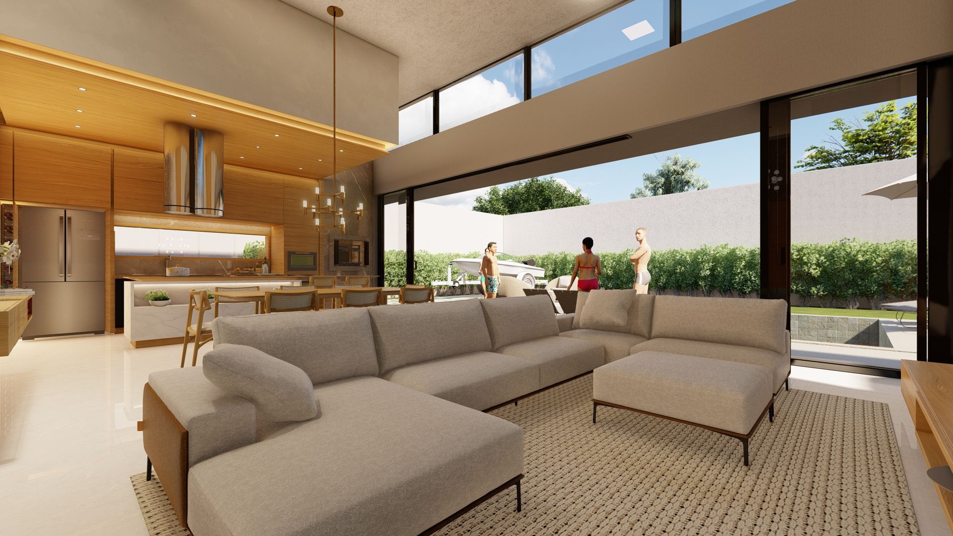 - Sala de estar e jantar e churrasqueira totalmente integradas e com pé direito duplo.